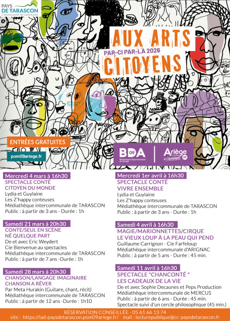 Du 4 mars au 11 avril, ces spectacles s’inscrivent dans le cadre de la programmation “Par-ci par-là Aux Arts Citoyens” de la Bibliothèque départementale de l’Ariège.